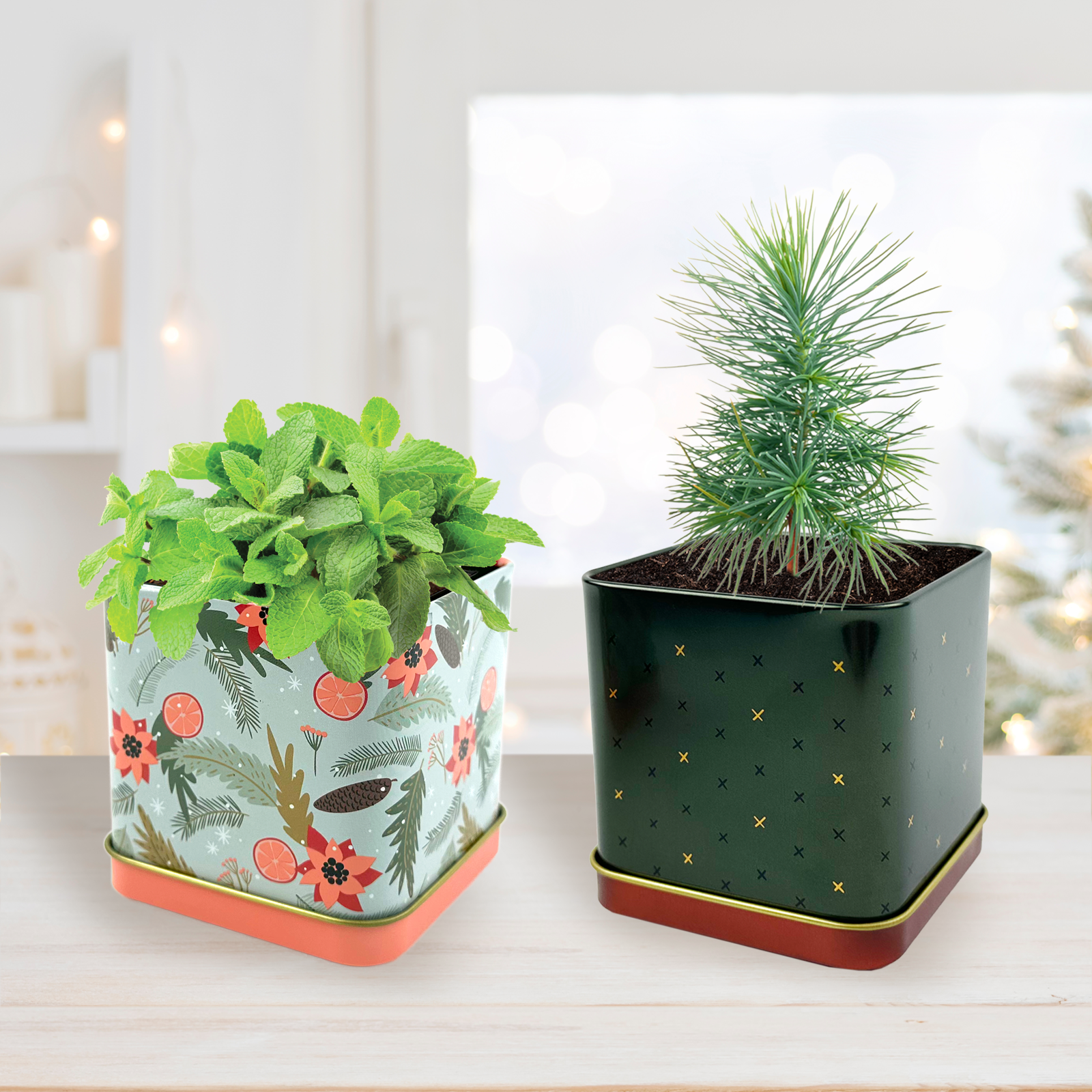 Featuring two classic holiday favorites - Spruce and Mint - our Holiday Decorative Tin Grow Kit Duo includes everything you need to start or gift the perfect festive holiday garden: seeds, growing medium, a decorative printed tin, and our simple growing instructions. Just add water, sunshine, and love. Green thumb completely optional.